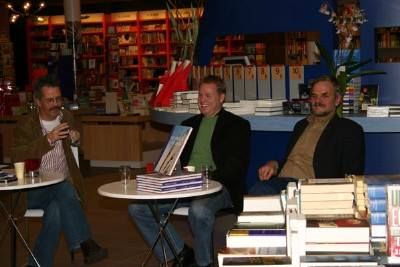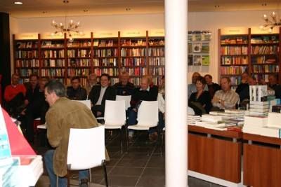 Fandaach un drukke dach had, na skoaltyd nòch un lange fergadering, dat ik hew de put der nou even út. Tòch un goëd gefoël. Gisteravend un prachtavend had met Jansen & Jansma bij boekhannel Van der Velde. Ik kon ut met beide mannen wel pratende houwe, en dat is noait wech at je met un interview bezech binne. Was ok aardech wat publyk, wêronder wear heel wat bekende Snekers. Klaas Jansma praat over un skútsje as het ie ut over un moaie jonge meid. Súver eroatys! KaBe het un antal moaie foto's nommen, dy't bij dit dachboekstukje staan. Paul van Goor had gisteravend al un jubileumboekje fan Onder de Linden metnomen. Wauwww!! Kom ik later op teruch want mòrren is de anbieding fan ut earste eksemplaar, an mefrou Himke Bolhuis. Der gebeurd op dit moment even fan alles tegelyk, want na de boekanbieding + ut feest mòrren, staat ut Ouwejaarsfers sentraal. 'Un paar grammen tefeul ' sei oans fader froeger altyd en dêr futdaleks achteran 'fine je nyt erch nou?'