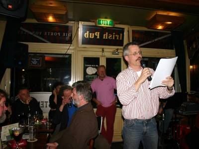 Gisteravend teugen elven liep de Ierse Pub helemaal fol, gròtfol wel te ferstaan. Toen was ut kònsert fan Cuby in Amicitia oulopen. Un groate grize tsunamigòlf kwam bij Jan en Helga an de bar om nòch even wat te drinken. Ut Literêre Sirkwy was toen al achter de ruch. Ut antal besoekers fan dizze poëzy-manifistasy fiel nyt iens teugen. Lekker publyk om foar foar te lezen. Der binne dichters bij, dy kanne beter skriëve as foarleze, su bleek gisteravend mar wear us. Gelukkech kan Cor van der Wal beide, prachtege autentike fersen en un prima foardracht. Forza Knilles! Ik hat self na ouloop fan myn foarlezen un goëd gefoël. Lekker ontspannen òk. Ut stuk over ut Snekers as poëzy-taal hew ik opdroegen an Helga. Op de foto's is te siën dat Helga, krekt as oans moeke òk fan Drents komou, met folle teugen geniet. Ik nyt minder... KaBe wederom bedankt kearel foar ut maken fan de foto's. Ik kreech òk nòch de groeten fan Moaie Manon. Myn avend kon dus nyt mear stukken. Sukrekt un interview met IFKS-regelneef Lieuwe Bergstra út Drylts hat. Nau sal ik met P. naar Swolle. Open dach fan de PABO ( Windesheim ). Ut leven is fleurech, letterlek en figuerlek.