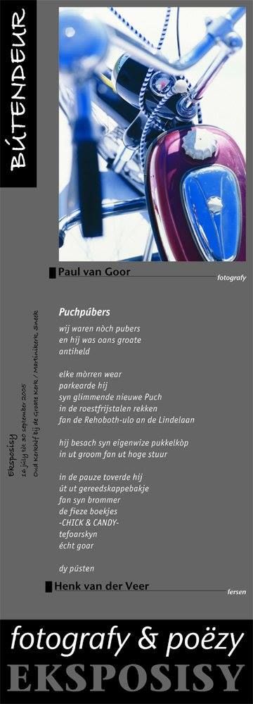 Hearleke temperaturen! Lekker lesgeven en nau langsaaman naar de fekaansy toe. Wat un lúks leven hew ik tòch. De meeste lui dy't Paul en ik un útnoadeging foar oan eksposisy toestuurd hewwe, binne héél entûsiast. Moai! In de 'Wijd en Zijd' fan fandaach un moai opmaakt stukje over ' Poëzy op Poaten' op de foarpagina, kompleet met de foto fan de Puch dy't òk op alle posters prònkt. An oans pee-er sal ut nyt lêge, mar úteindelek mutte de foto's en de fersen ut doën. De pc doët ut in elk gefal nòch nyt, want ik mocht ut fan Theo & Mark & Cathrien, alle dry kompjoertòppers, tòch echt wel un CRASH noëme. Wannear ut ding wear klaar is? Gyn flau benul, mar de dachboekstukjes bliëve kommen. Fanút ut MyriadM-kantoar in Sneek.