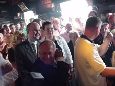 "Ik had U hier eigenlijk in een olijk matrozenpakje verwacht!' Diskear nyt in ut Frys, mar in dy andere rykstaal. Burgemeester Arno Brok wond der gister gyn doekjes om dat hij Thierry Kamminga in un passende outfit ferwacht had bij de presentasy fan 'Ik sil sile...' De opmerking fan Brok sette trouwens wel de toan fan ut bearegesellege feestje in CHEERS. Thierry song as un lyster, Joop Braakhekke roerde in ut Sneekweekpantsje en de frynden fan de singende kroechbaas fonnen ut allemaal prachtech. Se waren der alemaal Joop D., Harrie A., Paul van G., Anneke D., Marius de B., Eldert M., Frits R. en C. met un koket swart baretsje. Albert van K. en Louis W., beide hewwe ut fak bij de 'Sneeker' leart, genoaten sichtber. Feestfiere in de baas syn tiid, wie wil dat nau nyt? De Sneekweekhit 2005 fan Thierry het twee ferzy's 1 foar de sundachmòrren bij ut wakker wurden en 1 foar de 'party-time' in un wel héééél rap tempo. Ik gaan foar de snelle ferzy! Ut moaiste fan ut hele feest fon ik moeke Tjitske, dy straalde fan oar tòt oar, su as allienech moekes strale kanne!