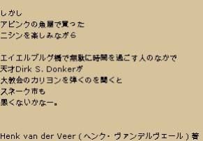 Shikashi Abingu no sakanaja de katta Nishin o tanoshiminagara Eieruburugu hashi de moeda ni djikan wo soegosoe hito no naka de Tensai Dirk S. Donker Daikijookai no karijon wo hiku no o kikoe to Suneeku mo Waruku nai ka naa.