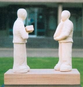 Maandach krije Paul van Goor en ik un priis. Dat is noait wech, helemaal nyt as ik jum skrief dat dit un lanneleke onderskeiding is. Ut ferhaal achter de priis. Elk jaar is der un groate fergadering fan de VNG. Dy letters staan foar Vereniging Nederlandse Gemeenten. Op dat kongres kwamen dit jaar mar lyfst 467 gemeentebesturen af. Met mekaar 2.500 tòt 3.000 burgemeesters en wethouwers. Op dat kongres stonden un antal bedrieven ( adfysburo’s, banken ens. ) met un stand. Ut tema fan ut kongres was dit jaar ‘Burger in Beeld’. Ok ut kolleezje fan B.& W. fan de gemeente Sneek besocht ut kongres. Bij één fan de kramen het wethouwer Jan Bargboer, út naam fan de gemeente, un kaartsje infuld met ut folgens hem bêste burgerinisjatyf. Hij skreef op ut kaartsje over ‘Poëzy op Poaten’. En dat Paul en ik met ‘Poëzy op Poaten’ keunst naar de burgers brenge en hierdeur de samenleving posityf beinfloede. Moaie woarden, mar dêr bleef ut diskear nyt bij. De inisjatyfnimmers fan dizze ‘wedstryd’ binne ut blykber helemaal met wethouwer Bargboer eens, want út de honderden insendingen binne wij foar de priis nomineard, sterker nòch: wij krije de priis, in de fòrm fan un beeldsje! Dat beeldsje sal maandachmiddach an oans útreikt wurde. Inderdaad su groats as un kyp met fier poaten!