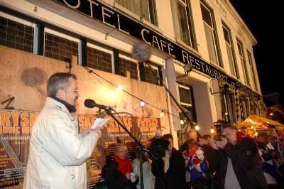 Ut regende un bitsje, toen ut klòkje fan de Waterpoart fanmiddach ses kear sloech, mar ik foëlde de novemberkou nyt. Hoe sú ut ok anders, temidden fan de Blauhúster Dakkapel dy’t de regenpannen fan ut dak speulde. Temidden fan al dy Snekers dy’t naar ut Hotel fan Jikke Ozinga kommen waren om ut nijs te hoaren dat der nieuw leven is foar de fermaarde Stadsherberch. Hearlek om dêr op ut stoepke fan ut ouwe pand, onder de Jugendstyl gevelstien myn fersen over de legendarise Jikke van der Horst - Ozinga foar te lezen. Ut was krekt of de groënwitte markiezen der wat minder súterech bij hongen as oulopen somer bij temperaturen fan plus 35 graden. Eén adfys nòch: Ut is te hopen dat de fraaie toegangsdeuren fan ut Hotel der su gau mooglek (tidelek ) futhaald wurde. Foardat ut te laat is!