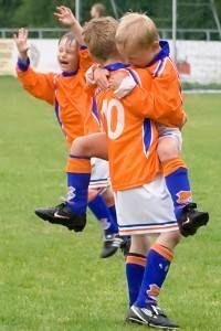 mei de tinne knibbelskonkjes fan ’e lytse foaltsjes draaft se mei de fuotbaljonkjes tusken beide goaltsjes
