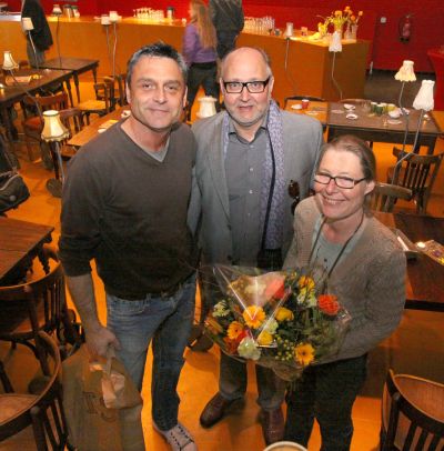 Directeur Ben van der Knaap ( midden ) Theater Sneek met 10.000ste bezoeker( Foto: Simon Bleeker )