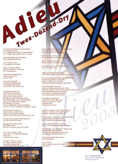 Dizze regels inspirearden maat en keunstfotograaf Paul van Goor om de gedichtepòster fan ut Ouwejaarsfers op te sieren met un foto fan de betreffende Davidsster. Ik bin der fan overtúgt dat poëzyliefhewwer Hartkamp en Sneek-watcher Wiersma beide toen de foto’s fan de Pino-rútsjes onder ogen had hewwe. En nou’t ik tòch wear an ut skoalmeesteren bin, ik weet dat der op dit moment druk werkt wurdt an sogenaamde ‘ stroffelstienen ’ dy’t de plakken angeve dêr’t Joaden in de stad leeft en woant hewwe. Un prachtech inisjatyf, wêrover later wel mear.