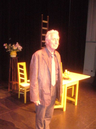 Tòch kwam ut gisteravend allemaal heel dichtbij, letterlek en figuurlek in dit prachtege festje-búze-teater fan Sneek. Ik hoorde de ouwe man puffen en stinnen bij ut skoënfeteren! De Goudfisk is ok de histoary fan un dòrp, fan de dingen dy’t foarbij gaan. Fan ut plattelaansleven, un Sneker met syn kleinstedelek denken ok nyt freemd. De ouwe man op ut poadium houdt ut klein, houdt ut herkenber. “ In âlde man is mar in neatich ding! ” Ut ferhaal speult um ou in un húskamer dêr’t alles brún is, tòt ut earpelskilbakje en de fluitketel an toe, behalve ut koffykòpke fan Houkje dat wit is. Moai fon ik ut stukje monolooch over leeftyd. Foar jonge minsen gaat de tyd noait rap genoech, ouwere minsen ( mar wat is oud ? ) toffele achter de tyd an. Dat de ouwe man op opfallende rútsje-motyf-pantoffels beweegt krijt in dat licht un demênsy mear. Dizze ròl fan ouwe man is Gratama op ut lief skreven, hoe’t hij beweegt, hoe’t er siet mar ok hoe’t hij der út siet, wat um bezech houdt. “ De minsken tinke dat ik homo bin, mar dat is net sa. Ik bin op in leeftyd dan kinne je út alle kasten komme, mar út de kiste komme je net ! ”