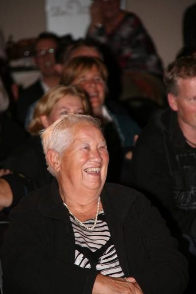 Waterpoartster en earegast Greetje Slippens-Poiesz geniet met folle teugen fan ut optreden fan Hayo Apotheker en Kees Poiesz.