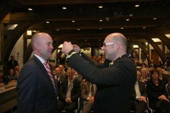 Locoburgemeester Hans Spigt hangt Arno Brok de ambtsketen van Dordrecht om. ( bron/foto TV Rijnmond )