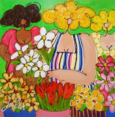 Julia Woning-van Klaveren (1969) uit Bergschenhoek volgde van 1990 tot 1994 de Academie Beeldende Kunsten (nu: Willem de Kooning Academie) te Rotterdam in de afstudeerrichting illustreren. Zij werkt als freelance illustrator, portrettist en beeldend kunstenaar. In het begin via het agentschap Top Drawers te Amsterdam. Julia illustreerde voor Esso, Shell, Uitzendbureau Start, Safari, Rabobank, Admiralis, FNV bondgenoten etc., maar ook voor visuals en inkter/painter (inkleuren van annimatie cels) draaide zij haar hand niet om. Tegenwoordig werkt zij als zelfstandig kunstenaar voor opdrachtgevers. Maar ook is zij, na de geboorte van haar kinderen, steeds meer vrij werk gaan maken. Zij heeft een nieuwe serie werk gemaakt, Dikke Dames. Vrolijke vrouwenfiguren in dagelijkse dingen. Telkens is zij op zoek, naar vrolijkheid, sfeer, verhoudingen, vormen, structuren en naar combinaties van kleuren in haar werk. Zij hoopt dat een breed publiek haar werk kan zien, aanvoelt en daar vooral vrolijk van wordt. Inspiratie haalt zij overal vandaan: bij het ontbijt met de kinderen of tijdens het strijken, maar ook bij een kop thee kunnen soms de gekste ideeën opkomen. Het kan zijn dat zij dan ineens weet hoe ze een werkstuk moet beginnen of afmaken. Het moment van stoppen is het moeilijkst. Te lang doorgaan kan het schilderij ontkrachten. Na de vernislaag geniet zij van de reacties en staat ze weer te popelen om aan het volgende stuk te beginnen. Schilderen geeft haar rust, warmte en vrolijkheid. Dat ook anderen ervan genieten, er vrolijk van worden geeft haar voldoening: als illustrator, vrij kunstenaar en begeleidster van creatieve workshops. Julia heeft o.a. werk verkocht in Nederland, Spanje, V.S., Belgie, Frankrijk en Duitsland.