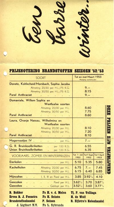 Fan broer Geert ( 1942 ) kreech ik un antal fraaie reklamefolders út 1952 met dêrop de namen fan de Sneker koaleboeren. Folgens Geert kwam Molenaar bij oans an hús. Dank foar de info.