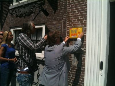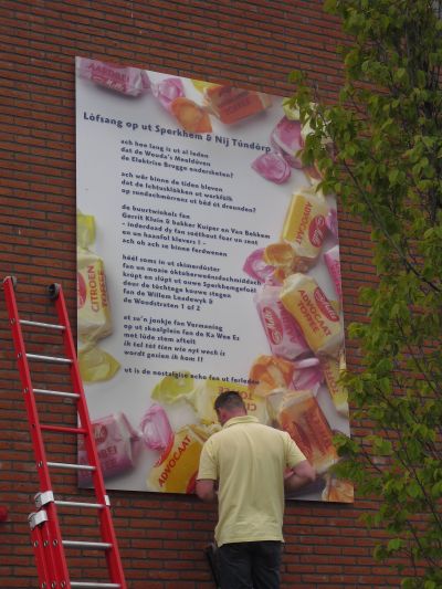 En wat te sêgen fan burgemeester Hayo Apotheker dy’t de haan der nyt foar omdraaide en lees ut fers dat hij nòch nyt onder ogen had had, spontaan foar. Dizze man het wat met ut stads, laat dat dúdelek weze! Naast de anbieding fan de plakette het de wykfereniging ok nòch un heel groat kanfasdoek met dêrop fers + foto kregen. Ok binne der mar liefst 700 eksemplaren op fraai papier drukt dy’t an de buurtbewoaners kado geven wurde. Ut kan nyt op. Moai man! Hierbij un antal foto’s fan de happening dy’t fanmòrren froech al begon met ut ophangen fan de plakette. Dizze hele week is ut nòch feest in de buurt.