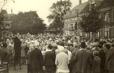 Met fijfhonderd kyndes klepperden se onder anfoering fan ut múzykkòrps ' Steun in de Strijd ' flink op los. Op de foto binne de kyndes anbeland op de Rienck Bockemakade. Dirigent J. Heslinga út Hearefeen staat op de stoël (Foto beeldbank gemeente Sneek).