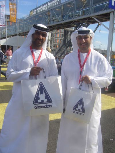 De earste Sneker dy’t ik fanmiddach na een weekje búten de deur wear sach was Piet Skaper. Hij ston op ut stasjon. Nee, nyt om oans op te wachten mar gewoan omdat Skaper dêr altyd staat te wachten op’e trein naar Staveren. Thúsgefoël hyt suks. Nyt dat ik de oulopen dagen onwennech weest hew, je kanne I love Sneek ok overdrieve nou?! Moai fut weest, naar Amsterdam en Wenen. Twee prachtsteden en fanmòrren fiel mij op hoe groat de kontrasten binne tussen dizze twee Capitolen. Wenen súper netsjes en geòrdend, Amsterdam un groate gaos. Teminsten ik fon ut fanmòrren un soadsje in Mokum. Tramlijn 5 reed ik elk gefal nyt en dêrdeur fiel ut hele reisskema richting Sneek in duigen. Ut had te maken met de ‘ overvloedige regenval ’. Al met al mear as 4 en un half uur onder de pannen om fanút de Hoofdstad in Sneek te kommen. Nee, Amsterdam sach der foarege week met Sail heel wat fleureger út. Dat was trouwens ok ut laaste wat jim fan mij fernomen hewwe. Nee, wees mar nyt bang dat ik nou met un útgebreid reisferslach kom. Sail fon ik trouwens fantastys! De beloofde foto hieronder. Ik fyn ut persoanlek un foltreffer, twee sheiken út Dubai dy’t reklame foar Gaastra make. Ut Waterpoort-beeldmerk fan Gaastra komt wel héél fraai út!