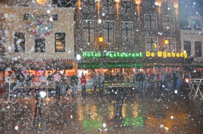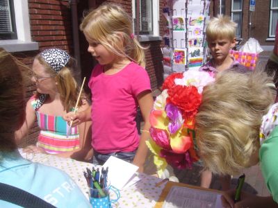 Op de Koopmansgracht binne de dingen ok al in gereeedhyd brocht. Gerard de Jong ( Bertus út de Bonte Sneker Avend ! ) sit met syn frou Atty al klaar. “ Gaan sitten wat wústou wete?” Alles! Nou dat ‘ alles ’ binne 25 keurech ferfde groëne palen. 500 meter kleurege flagjes en un lading lampkes dy’t fanavend foar de feeërike ferlichting sòrge mut. “ Dy lampkes hale we één foar één út ut doaske, draaie se één foar één in de pitten en fier dagen later in de omgekearde fòlchòrde ”, seit Gerard met un groate smile. “ We òrganiseare dit met de buurt. Eén kear per jaar un bbq dy’t de minsen self betale mutte, ik loof 12 euro fyftech en dan krije we ok nòch 150 euro subsidy fan de gemeente. Nou su hewwe we dan un pòtsje wêr’t we dit út betale. Atty beheart trouwens de Rampepòt. Ja, betale we ok de bloemen foar bij geboartes en overlijden…”