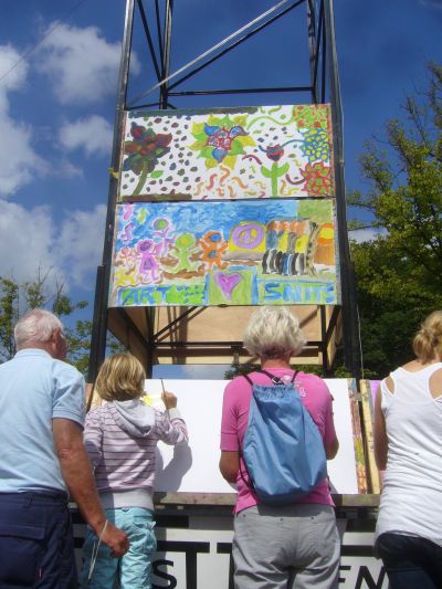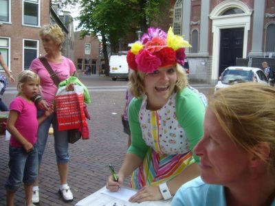 Twittere? Nee Wopke, Anske & Cor, ik blog wel un bitsje faker at der wat te rêden is. Sukrekt wear un loopke deur de sonovergoaten stad deen. Ut Straatfestival trekt un soad besoekers en ut is un fleurege gesellege boël in ut sentrum. Je salle mar toerist in Sneek weze, dan falle je met de neus in de kulturele butter. Dochter Piety ( = www.katreinkunst.nl ) is aktyf an de foët fan de Groate Kerk. Kyndes skildere kleurege kaarten foar minsen dy't se helemaal nyt kenne. Katrein Kunst òf de kyndes nimme un willekeurege bladside út ut telefoanboek, wize al like willekeurech un adres an en dêr gaat hun kunstsinnege kreasy naar toe. Simpel mar prachtech idee! Ferder ok folop fertier. Over anderhalf uur nòch even mear reklame foar de stad make op Omrop Fryslân.