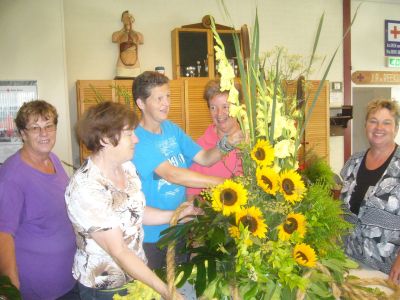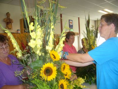 Hinke Bouma met de andere bloemskiksters an ut werk Onder leiding fan Hinke Bouma binne de dames Ulkje Bonsma, Bonnie Cnossen, Klaske Schaap en Jacqueline Aukes druk bezech met ut klaarmaken fan de gigagroate bloemstukken dy’t fanavend op de ferskillende boaten komme. Hinke Bouma: “ In jier as sân lyn hawwe se my fanút Groei & Bloei frege om ris mei te dwaan. Nei in jier seine se tsjin my ‘ no sa giet it ’. En dat wie myn foarbereiding. Harm bellet my elk jier wer op om dit ûnderdiel fan de floatskou te regeljen. Ik doch it graach. It is oars wol spesifyk wurk. De boaten farre yn’t tsjuster, dus wy brûke gjin donkere kleuren oars sjocht it públyk allinne mar swarte gatten. De blomstikken wurde yn plestik tobkes setten of yn piepskúm sadat de boaten net skansearre wurde. Dit jier brûke we in soad tou, dy’t we ynmekoar frissele hawwe fan pickup-toutsjes. En der sitte ek noch al wat tuorrebouten tusken. Eins in beskermde plant, mar oars dan hekkelje de mannen fan de gemeente se dochs wei. Wij snoeie eins foar de gemeente. En ferkillende froulju litte yn harren tún de prei trochsjitte, krijst prachtige blommen. It moat eins elk jier grut, grutter nei grutst! ”