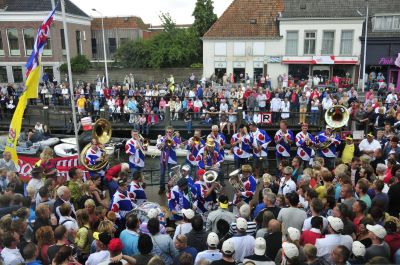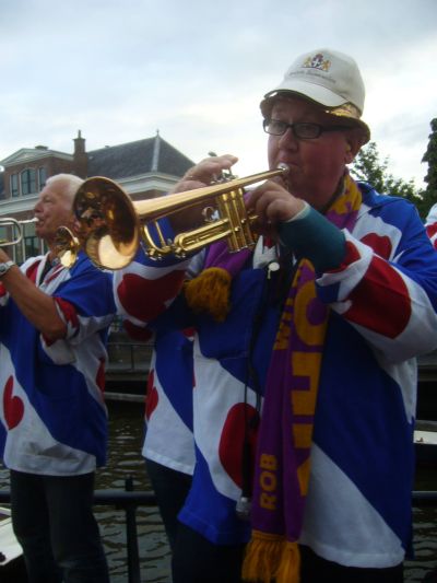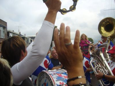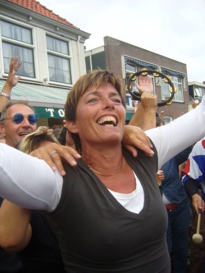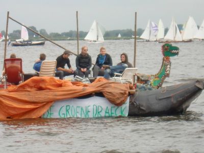 Harm maant al wear tòt aksy, de treetsjes frisdrank en bier mutte besòrgt wurde op faste ankerplakken foar de dweilòrkesten. Dweilòrkesten? Ja, un wezenlek onderdeel fan de Floatskou wêrbij’t de òrkesten allemaal deur Harm regeld wurde. Un bealechfol werk omdat in de fakaansyperioade un soad òrkesten letterlek nyt thúsgeve. Mar wie’t eenkear metdeen het, wille graach wear teruchkomme. Harm blieft echter selektyf. Eén fan de pleisterplakken is de fantastys legen woaning fan Alie Hoogland & Hans Faber an ut Somerrak. De enege karakteristieke woaning dy’t staan bleven is in de loop fan de jaren. Alie: “ Ut is hier un gouden plakje, we ergere oans noait an de boatsjeminsen dy’t letterlek an oans achtertún oumeare. Gewoan even goeie ouspraken make en gastfrij weze. Laast was der un hele ploech met studenten dy’t anleiden. Komt su’n student bij mij en fraagt ‘ mevrouw heeft U ook een strijkplank voor mij, want ik wil dit witte overhemd vanavond aan ’ Ik sei ‘ bistou besopen kom op met dat overhemd ’ en ik hew ut keurech foar um streken. Kiek dan krije je noait ròtsoai!” Fanavend hewwe de Fabers un kompleet buffet klaar staat foar de múzikanten dy’t na de floatskou bij hun del komme. Ut is bearegesellech su fersekere se mij.