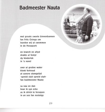 Mut even reagere naar aanleiding fan dien blogje fan 16-02-2011 over het zwembad. Ik sien badmeester Nauta oek nog so staan. Ut was een man van Law & Order. Foor mij as klein jonkje was ie as een generaal, die deur sien commando's bij 't binnenkommen deur het draaihekje niks an onduudlikhied overliet.