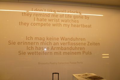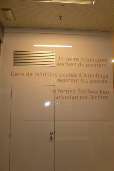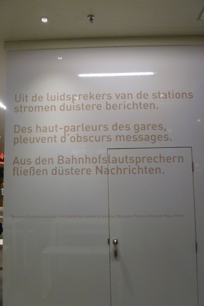 Toen soan Ben en ik foarege week op stasjon Brussel Súd wachte moeste namen we un bakje koffy en dêr in de Brusselse eethoek fan ut stasjon fiel myn ooch al gau op de poëtise teksten dy’t deur ut dichterskollektyf anbrocht binne: ‘ Uit de luidsprekers van de stations // stromen duistere berichten ’ en ‘In verre seinhuizen // werken de dichters.