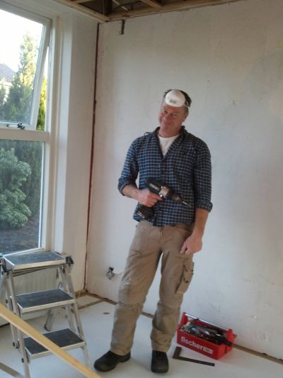 Tuurlek binne dy boufakkers ok wel un bitsje poëtys, at je der mar ooch & oar foar hewwe. Ik mocht fandaach in de buurt fan timmerman Anne Visser weze. Sinds 2009 het Anne syn eigen klussebedrief ( un ander seit wel ‘ bedriefke ’ hew ik um foar houden, mar dat tersijde). Nyt allienech bivakeare in de buurt fan de klusmaestro, ik mocht selfs even un boarmasine fasthouwe, om skroeven in ut gipsplaten plafòn te jensen. De earste de beste skroef ging úteraard su bryk as’t mar kan. Mar in plak fan nòch un kaans, gaf timmerman Anne mij nòch twee kaansen. Hew ik met beide hannen angrepen., teminsten ik hew krekt deen asòf. Mar teruch naar de poëzij onder boufakkers. Anne singt de gòdgaanse dach Nederlaanstalege teksten, foar un gedeelte simpelwech lutten fan artysten as Jan S. en de dry Jees. Foar un ander gedeelte selfbedochte teksten op bestaande melodytsjes. Dy laasten hewwe myn foarkeur. Dat fyn ik dus pure boufakkerspoëzy. Ut meast poëtise fan timmerbaas Anne fyn ik de naam fan syn eigen site: VISSER TIMMERT! ( http://www.vissertimmert.nl ) Kiek dat is nòch us ferrekte orizjineel. Anne was wel su earlek om toe te geven dat syn frou de naam bedocht het. ‘k Hew um beloofd dat ik dêr ferder nyt over prate sú. Over skrieven hewwe we ut fandaach nyt had. Der binne ommers feul belangriker dingen in ut leven fan un boufakker! Ik snitter nou dat ik in de tobbe gaan, ut is tòch wat om us écht an ut werk te mutten.