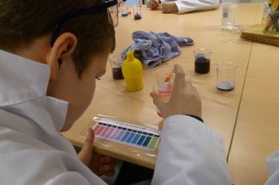 Natuur- en skeikunde binne bij oans op de Praktykskoal onderskoven kyntsjes en dan druk ik mij ok nòch eufemistys út. Fandaach was dat anders. Kollega Carin Boersma fan Bogerman kwam del om met myn groep un antal skeikundeproefkes te doën. Allienech ut antrekken fan su’n écht witte laboratoariumjas geeft al un bepaalde kick: Kleider machen Leute is’t nyt su?! De kyndes hewwe fan ferskillende produkten de suurgraad meten met behulp fan roaie koal sap. Prachtech om te sien hoe’t de púbers met hun miny-ondersoekjes bezech waren. Learen deur doën en mekaar útlêge hoe’t yts sit het tòch feul mear as ut tradisjonele learen.