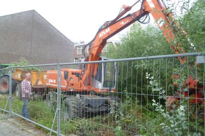 Twee weken leden bin ik mar wear us begonnen met ut bloggen over wat hier in de Julianastraat gekskearend ut oerwoud noemd wurdt. Naast ut Witte Kerkje ( in de fòlksmoan nòch altyd ut Stúfmeelkerkje...) is na ut oubreken fan de ouwe fabryk un braaklêgend terrein komme te lêgen. Ferskillende plannen over de herinrichting raakten ergens fersyld in un burolaad en al helemaal toen der ok nòch un fallisement om de hoek kwam te sien. Gynéén foëlde siich toen mear ferantwoardelek om de wildgroei binnen de perken te houwen. Gefòlch un soad overlast fan neven en ander ongedierte. Tòtdat wethouwer Gea Akkerman har der persoanlek met bemoeien ging. En sien dêr stonnen fanmòrren de mannen fan loanbedrief Wierda met groat materiaal om ut karwei te klaren.