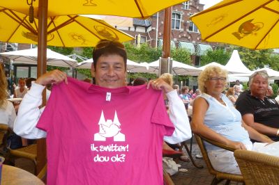Helemaal in styl, met nyt te min an hemelwater, hewwe we as Snitteraars gisteravend Sneekweek 2011 ousloaten. De Marktstraat lach der troasteloaser as troasteloas bij. Nòch één kear kwam ut water met bakken naar onderen, krekt tussen 19.50 en 20.15 ut moment súprême om ut su mar us plastys út te drukken. Mar dappere Snitteraars late sich nyt ferkatse deur barre wearsomstandechheden. Foto-shoet is foto-shoet. Heleen Sonnenberg was der met un fraaie sakflakkon Snitterbitter, dy't fandaach al bij De Weduwe te koop is. Fan elk ferkocht fleske gaat der één euro naar un fòlgend goed doël. De opbrengst fan de Snitter T-shirts het definityf € 1250 opbrocht. Foarwaar un prachtech resultaat foar de Stichting Aangepast Zeilen Sneek. Binnenkòrt nim ik komtakt met Maria Poiesz op foar de overhandeging. Ok gisteravend wear feul andacht fan de provinsjale media. Jaja ut is komkommertied eekmiegers, wij as Snittereaars beseffe dat oans terdege! Resultaten fan fotograaf Simon Bleeker binne fanmiddach te sien in de LC en ut FD. Nou earst even oustaan fan ut snitteren, overdaad skaat seit ut spreekwoard. Nou ok wel even genoech fan de Sneekweek en met al dy ferregende toeristen hew ik ut ok wel had.