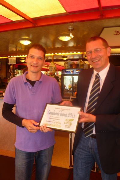 Smûk, un ander woard kan ik der nyt foar bedenke, was fanmòrren de priesútreiking fan de moaiste kermesatraksy's 2011. Ut gebeurde in de lúkse Poffertsjeskraam fan de family D.J. Pieters - Geeris. Maarten Offinga, hoe graach hij ok wú, kon der nyt om heen tòch nòch even de belabberde wearsomstandechheden an te halen in syn toespraak.