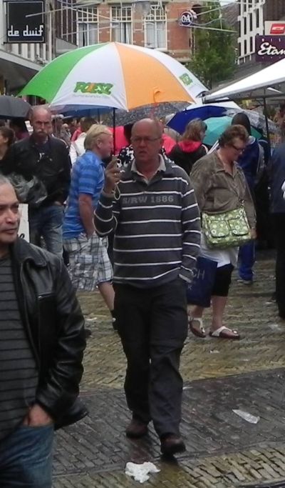 Hoe kanne je Sneek op Hardsyldach 2011 moaier onder woarden brenge as met dizze kòstleke foto fan Nico Altenburg. Bert van der Harst, werknimmer bij groatgrutter Poiesz, maakt selfs op syn frije dach nòch reklame foar de winkel wêrt't ut opfalt dat ut metfalt! Allienech ut hemelmaaiem komt nòch immer met bakken naar onderen, dat falt dus nyt met!