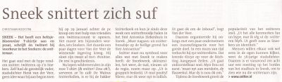Fandaach binne 150 SNITTER T-shirt’s binnen komen in de maten M-L-XL-XXL. De tekst: IK SNITTER! DOU OK? Ut logo is un ontwerp fan snitteraar Gert Jan Hermus. Un drytal Sneker ondernimmers hewwe de drukkòsten foar de shirt’s betaald en sudoënde blieft der niks an de beruchte strykstòk fast sitten. Mòrrenfroech om 10.00 uur start de ferkoop fan de shirt’s foar ut Stadhús in de Marktstraat. GAY PTV sal opnamen make en direkteur Wout Gerstel het al angeven un warm pleitbesòrger fan de SNITTERAARS te wezen. De kleur fan de shirt’s is Beltsjebloemrôze! Uteraard met ut ooch op Rôze Maandach fan de Sneekweek. De shirt’s koste 10 euro en binne na mòrrenfroech te koop bij Groënteboer Lubbers an de Liwwarderwech.