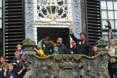 Wat un spontaan feest fanmiddach, earst wurdde de kampioënen massal toesongen bij de Waterpoart, tidens de intòch op ut skútsje. Dêrna in optòcht achter de Putkappel an richting Marktstraat. Op ut bòrdes opnieuw un huldeging deur un paar honderd Snekers. In de Stadhústún de ene lòfrede na de andere. Deur burgemeester Hayo Apotheker, Cor Reijenga ( St. Sneker Pan ), Karst Doevendans ( foarsitter Dicky van der Werffonds ) en Herbert de Vries ( foarsitter VSZ ). En de sprekers kwamen nyt met lege hannen, un paar prachtege cheques foar ut onderhoud fan de Panne! En...foar elk bemanningslid un fleske SNITTERBITTER fan de Weduwe!