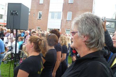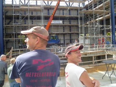 Eén beeld miste de wethouwer wel en dat was de meiboom op het dak. As kompensasy had Sinnema self mar un alternatyf boomke metnomen dat hij an projektleider Luiks overhandegde. Dêrna was der múzyk fan die Twa ( ? ) en spesjaal foar de boufakkers was weareldkampioën moanfluiten Geert Chatrou optrommeld foar un eksklúsyf konsert. Un bysondere middach foar wie’t der bij waren.