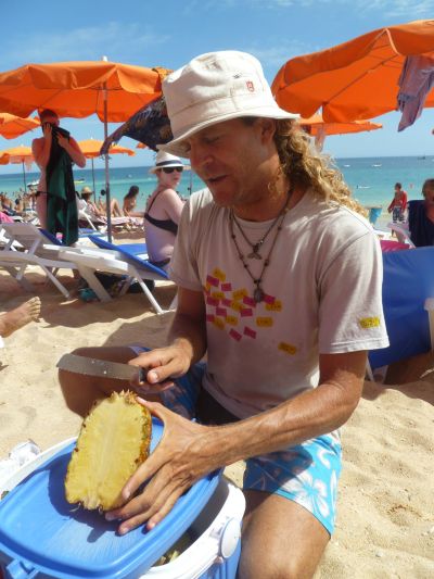Ik docht an Mario, de jonge met ut groate mes, syn krullebos en kòrte blauwe broekje. Mario brocht elke dach ferse ananas, dy't hij in moaie stukjes sneed, un ware artyst dizze Mario. Sit un fette kaans in dat hij fanmiddach waer op ut straan fan Albu was. Dy jonge het un prachtbaan en ik hew un fast inkommen. Fòlgende week gaan’k wear los. Ut sal ok tyd wurde na seuven weken lanterfanten.