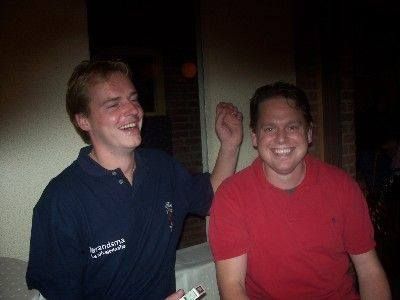 Bas Hollenberg, road shirt, met syn kompanjon Arjen Rusticus, in òktober 2006, toen se de deuren wagenwiid open setten tidens de Bonte Sneker Avend. Ut begin fan de fiktoary foar de Walrus.