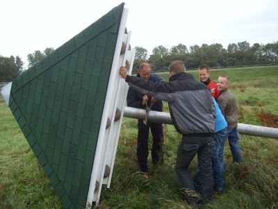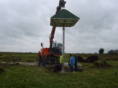 Ut was gister fanself beestewear, mar ondanks de harde wyn en de regen is de derde hússwalúwtil te plak setten in ut Rasterhoffpark. Ype van der Werf maakte un antal fraaie foto's. Su as bekend hewwe de learlingen fan oans skoal ( Praktykskoal De Diken )onder leiding fan Roelof Brinksma en Simon van der Made de tillen maakt.