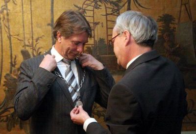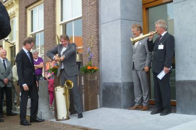 Om half fier had ik de afdeling kommunikasy an de telefoan. Op kommunikasy metwerker Marko syn fraach ‘ wat der an de haan was ’, hew ik um de prangende fraach steld wie’t nou ferantwoardelek is foar ut futhalen fan de atribúten an ut Sneker Muurke. Tòt myn stomme ferbazing kreech ik dêrna burgemeester Hayo Apotheker self an de lijn. ‘ De verantwoordelijke man staat hier in Stavoren naast mij, ik geef je de burgemeester!’