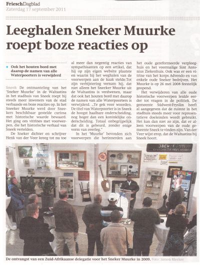 “ De amteleke òrganisasy fan de nieuwe gemeente Súdwest- Fryslân het besloaten dat dizze rúmte, ut Waltaplein, un ander karakter te geven, nadat de ouwe gemeente Sneek foar 1 jannewary 2011 de rechtmatege eigenaren op’e hoogte brocht had om hun spullen weer op te halen.” Op myn wederfraach wie’t dan fan de foarmalege gemeente Sneek dizze beslissing nommen het, wist Boorsma gyn antwoard. Ok nyt òf dizze opdracht deur un amtenaar òf kommissy fan de huidege gemeente SWF geven is. Met andere woarden, Boorsma kon mij gyn namen geven. Wel het hij toeseid om de ferantwoardeleke persoan(en ) te achterhalen. Dit krijt dus un sturtsje.