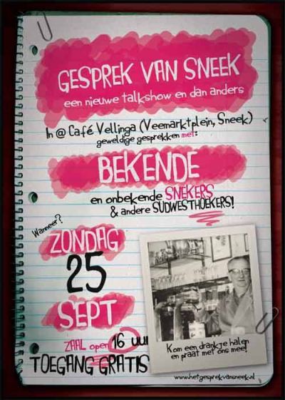 Gistermiddach is in één fan de moaiste horeka-lokasy’s fan Sneek, Café Velling aan de Kòrte Feemerkstraat, de outrap deen fan ut Gesprek Van Sneek. Met as ondertitel ‘ een nieuwe talkshow en dan anders ’. Un antal lokale politisy, te weten Symen Wybenga ( VVD ), Gerben Gerbrandy ( FNP ) en Djoke de Jong ( PvdA ) krústen de degens over de gefòlgen fan Prinsjesdach foar de inwoaners fan Fryslaan in ut alegemeen en de SWF in ut bysonder. Loet Boot ( o.a. KNVB ), Arno van Solke ( V. C. Sneek ) en Titia v/d Broek ( RSG Sneek ) diskusearden over de sport. De ekonomy kreech syn gerak deur toedoën fan Theo Groen ( Makelaardij Sneek ), Arnold de Jong ( Rabobank ) en Jan Huisma ( woaningkòrporasy ZWF ). Kunstenaar Wigle Engelsma fertelde over un kunstwerk fan hem dat plaatst is in Sperkhem/Túndòrp. Henk Doevendans en ik hadden un bijdrage in’e fòrm fan un kollum. Presentatòr Jacques Monasch was de útstekende diskussyleider.