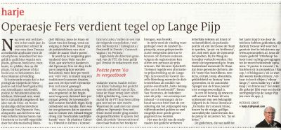 Ik staan helemaal achter ut foarstel fan Pieter de Groot! Wie nimt dêr in 058 ut inisjatyf om Operaesje Fers én Josse de Haan de ear fan un herinneringstegel te geven? Ut jaar 2012 leent um der prima foar: Josse de Haan hoopt dizze maand seuventech jaar te wurden! Kom op Tresoar, der plat foar!!