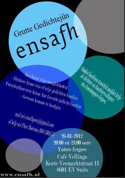 Donderdachavend sal ut heve, dan is der un groate gedichteavend bij Café Velling aan de Kòrte Feemerkstraat hier in Sneek. De avend is òrganiseard deur ut literêre tydskrift Ensafh. Nou kanne tydskriften fanself gyn dichtersavenden òrganisearen, dat wurdt deen deur de lui dy’t su’n magazine folskriëve, redigeare ensufoart. Cor van der Wal en Pieter Boersma, binne twee fan de minsen fan de òrganisasy. As lokale ferseskriëver hew ik hier en dêr haan-& spaandiënsten foar beide mannen deen. Ik doën ut met plezier, omdat ik weet dat ut in Sneek met ditsoarte fan aktiviteiten altyd goëd komt. We make der metmekaar ( ! ) un prachthappening fan. Hier hoeve wij nyt uren over te fergaderen, we belle Nico Vellinga op òf hij plak foar oans het, late un paar posters drukke en gaan ferfòlgens ferder met un reklamekampanje op twitter. Fantastys om te sien hoe’t social media nou ok wear werkt: allemaal plaatsleke dichters, wêronder un antal poadiumdebútanten, geve acte de presence. Der sal foarlezen wurde in ferskillende talen: Frysk, Snekers, Hylpers, Hollaans en miskyn is der ok nòch wel un eksoatys talewonder dat syn òf har poëzy naar foaren brenge wil. ‘ Omdat foarlêzen toarstich makket krije de dichters en foarlêzers allegear twa konsumpsjes fergees ’ staat op ut rútbiljet. Hoe moai kan ut leven fan un dichter ( m/f ) nyt weze. Der binne mar liefst 50 deelnimmers an ut poëzy-festival! Ik hew der nou al nocht an. Snitteraars & Sneekologen, ja iederéén fan harte welkom: Donderdachavend om 20.00 gaan we los. In Sneek begint de poëtise fiktoary!!