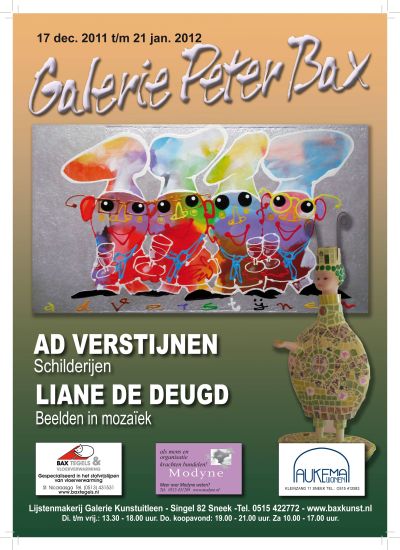 Gistermiddach de tentoanstelling fan Ad Verstijnen út Boxtel in un perfekte kombinasy met beelden in mozaïek fan Liane de Deugd út Peins bewònderd. Wat un feest! Wat un kleurepracht! At un mins hier nyt mear blij fan wurde kan, dan weet ik ut ok nyt. Ik wurd teminsten su blij as un kyn! At ik fanmòrren de achtergroaninfòrmasy bij dizze ekspo lees, bliekt dat Verstijnen en ik geliekstemde positieve geesten binne: