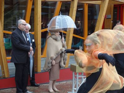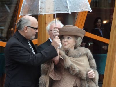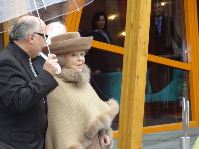 Un waar mediafeest was ut fanmòrren in ut hartsje fan de kulturele hoofdstad fan Fryslaan toen Konaning Beatrix op besoek kwa. De majesteit kwam 10 minúten eard as pland, mar der wurdde flot op antisipeard. Ut bloemmeiske, Lotte Dierick, boad Beatrix even foar half elf un boeketsje bloemen an en dêrna ging de Koaningin ut atrium binnen.