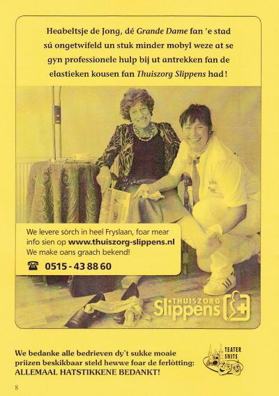 Ik hew ut su langsamerhaan helemaal had met dy foartdurende lekskoaierij, dy eekmigerij over ut teater. Foarmalech wethouwer fan Wymbritseradiel Gerben Gerbrandy, teugenwoardech raadslid fan de gemeente SWF, blykber krekt su: “ We hawwe it teater no yn Snits en no moatte we der meielkoar ek foar gean! “ Gerbrandy foëlde haarskerp an wêrom’t ik ut Frysk diskear as poëzytaal brúkte. Sterkernòch hij sei mij toe om binnenkòrt bij un passende gelegenheid ut Snekers aktyf te gebrúken! Hierbij ut fers: