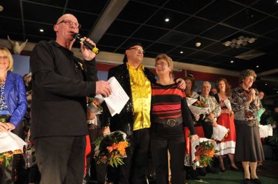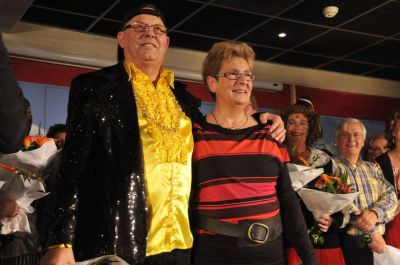 Omrop Fryslân presentatòr en sanger Douwe Heeringa in gesprek met Margryt de Vries, op'e achtergroan strak in't pak Wim Walda fan Groot Sneek.