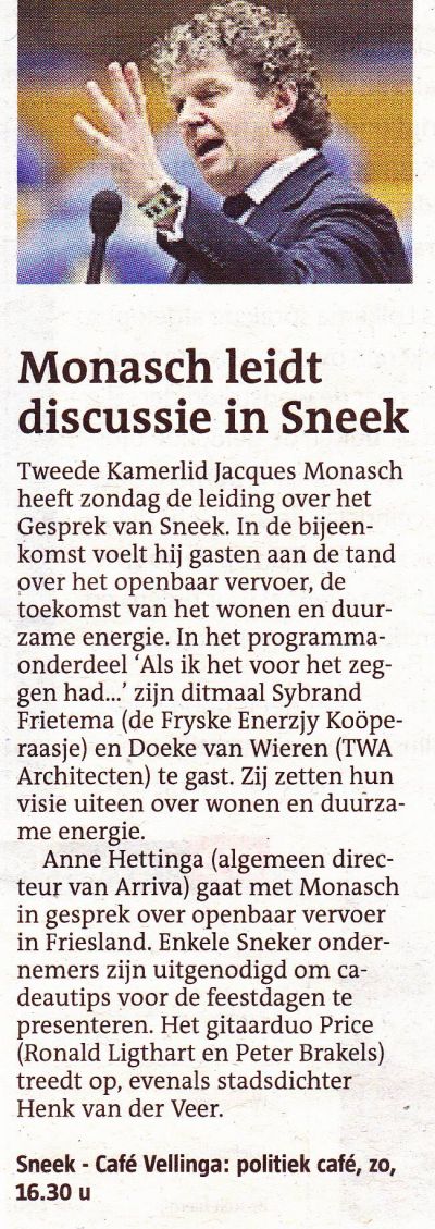 Fanmiddach ut tweede Gesprek fan Sneek, seizoën II had. Ergens an beginne is één, mar om ut fol te houwen is seker twee. Gelukkech bliëft de belangstelling foar dizze bijeenkomsten in Café Vellinga an de Korte Veemarktstraat groat. En wat ok belangryk is, ut nivo gaat nyt naar onderen, al is su’n opmerking útermate subkektyf, al helemaal at je faste faktòr in ut geheel binne. Jacques Monasch is sondermear un onderhoudende gespreksleider, dy’t der met syn team der kear op kear in slaagt om un kleurryk geselskap bij mekaar te krijen foar dizze gesprekken.