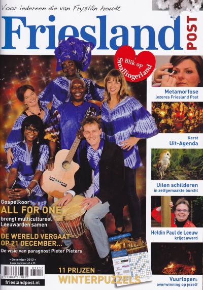 De nieuwe Friesland Post, dy fan de maand desember is út. Staat ok diskear wear myn faste boekebijdrage De Friese Veer in, met o.a. un resênsy over De Aartsrivalen, ut boek fan Sneker Harry Walstra over Nederlaan-Dútslaan. Sorry Harry, mar met de kòp boven ut artikel ging ut in de opmaak even ferkeard ( búten mij om...). Mar foar de rest prima! Ok un moaie repòrtaasje over ut multy kulty gospelkoar fan Wilco Kloosterman út Liwwarden. Wilco is in Sneek bekend as dirigent fan ut bekende gospelkoar de Signalen!