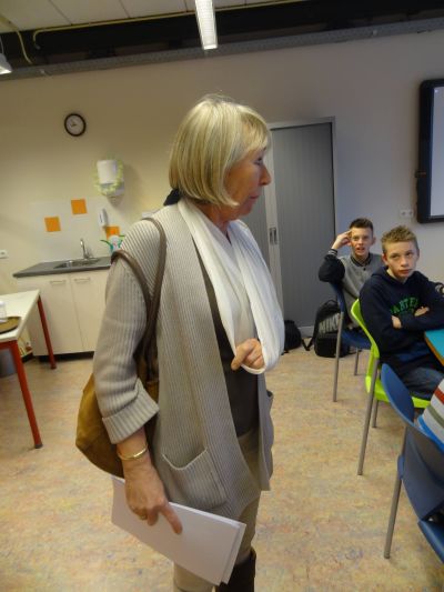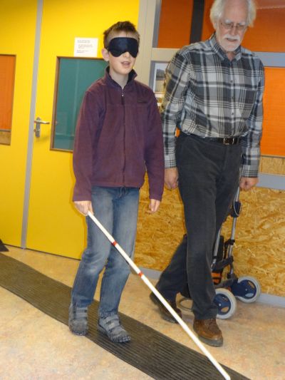 Wat ik un heel aardech onderdeel fon en de kyndes fòlgens mij ok, was andacht frage foar minsen met un fisuele beperking. Op syn plat Snekers: Blinen dus! De learlingen ( en ik úteraard ok ) mochten ervare wat ut earst om niks te sien. Un swart maksker op, met un blinestòk in de haan over un ribbelmat lope falt nyt met. Hearlek en earlek hoe open oans kyndes fan 'e Praktykskoal de fragen stelle. " Als U plassen moet, hoe doet U dat dan? " Ut antwoard fan de bline gastdosent: " Ik ga altijd zittende plassen..." Opmerking fan un andere learling: " Dat vind ik niet stoer voor een man, maar het is wel handig! "