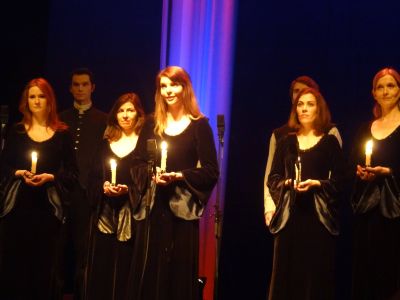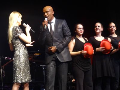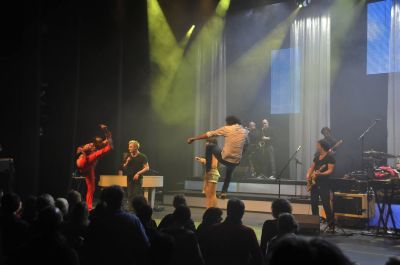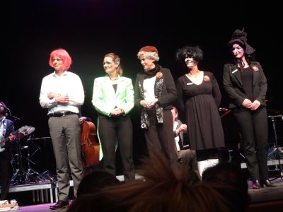 De enege sangeres út de band, Erica Groeneveld ( tòch gyn family fan de froeger pianohandelaar út de Sneker Galigastraat? ) had har ultrakòrtste rokje út’e kast haald, un lust foar ut ooch! En ok de súperhoge klik-klak-hakke-skoëntsjes fielen op. Wat un entûsiaste meid, dy’t de múzikale hoofdrol met beide hannen angreep. Har entûsiasme slaat over op ut públyk! Naast ( en dat is nyt denigrearend bedoëlt ) setten John Vooijs, dy’t ok bekend is fan de Tarzan-musical, William Kersten en Forrest Thomas un fokale presentasy fan mear as 2000 punten del.