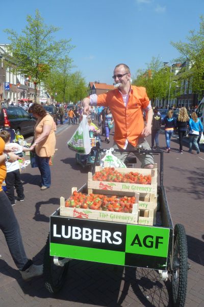Ok fan alle tiden is de foto met dêrop oans Stadsomroeper an ut werk. Ik bedoël dan écht an ut werk. Gistermiddach ging groënteboer Jan Sjoerd de Vries der met syn handel op út. Sútele òftewel fente met un bakfyts. Eardbeien had y in de handel en ut liep as un tierelier. Onder prachtege wearsomstandechheden ferkochten de somerkoaninkjes sichself hast. Mar dêrmet doën ik de snitterende-stadsomroepende groënteboer fan Sneek wear tekòrt!